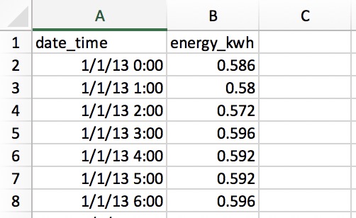 В строках указано количество электроэнергии, использованной за каждый час, таким образом, имеется 365 x 24 = 8760 строк за весь год. Каждая строка указывает на использование “начального часа” в данный момент, таким образом, 1/1/13 0:00 указывает на использование в течение первого часа 1 января.