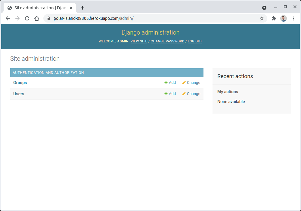 /admin, указанному после вашего уникального доменного имени приложения Heroku, например:https://polar-island-08305.herokuapp.com/admin/предварительно> кодовый блок>Вот как это должно выглядеть после входа в систему: