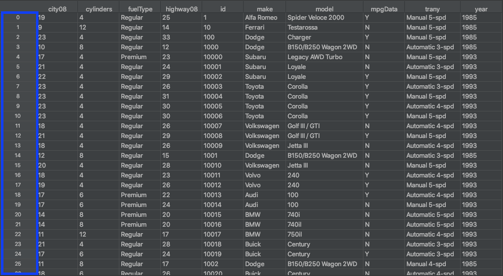 В этом руководстве вы будете работать с данными об экономии топлива, собранными Агентством по охране окружающей среды США (EPA) для автомобилей, выпущенных в период с 1984 по 2021 год. Набор данных по экономии топлива EPA великолепен тем, что содержит множество различных типов информации, по которой вы можете выполнять сортировку, от текстовых до числовых типов данных. Всего набор данных содержит восемьдесят три столбца.