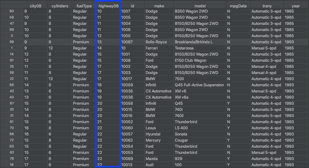 На рисунке выше показаны результаты использования .sort_values() для сортировки строк фрейма данных на основе значений в столбце highway08. Это похоже на то, как вы сортируете данные в электронной таблице с помощью столбца.