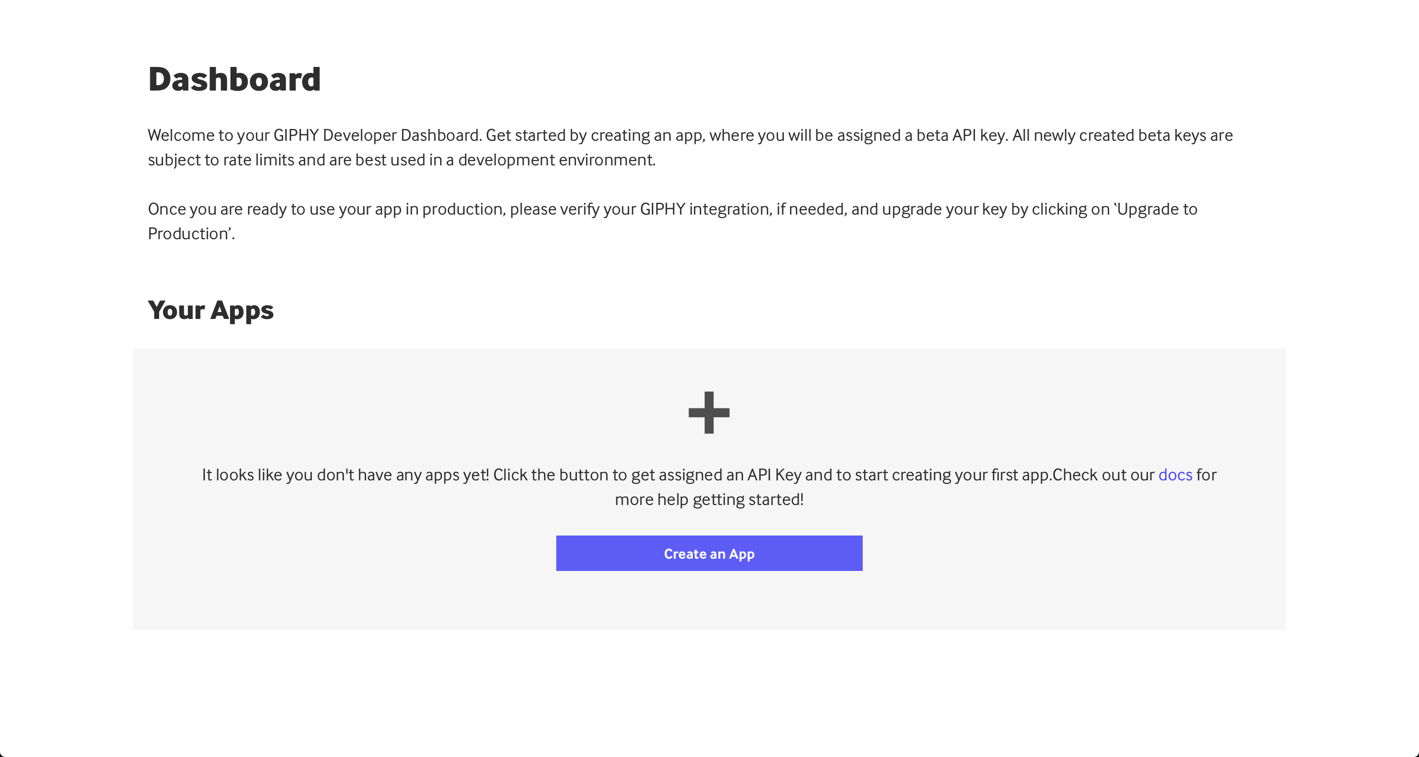 После создания вашей учетной записи GIPHY вы можете перейти в Панель управления разработчика, чтобы просмотреть существующие приложения: