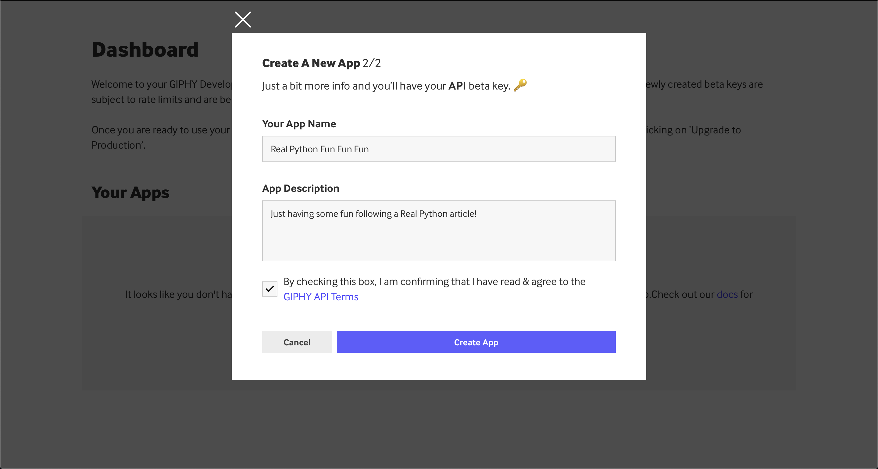 Как насчет того, чтобы создать небольшой скрипт, который будет извлекать три самых популярных GIF-файла с веб-сайта GIPHY? Для этого вам нужно создать приложение и получить API-ключ от GIPHY. Вы можете ознакомиться с инструкциями, развернув поле ниже, а также ознакомиться с документацией по быстрому запуску GIPHY .