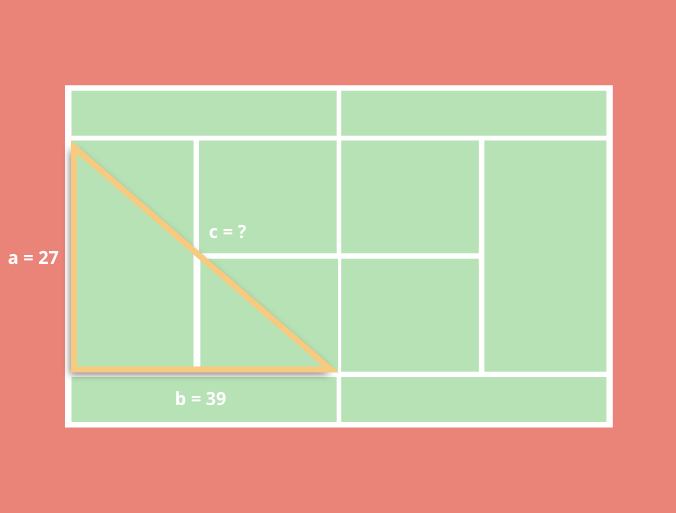 Исходя из нормативных размеров теннисного корта, вы можете определить, что длина базовой линии составляет 27 футов, а боковой линии с одной стороны сетки - 39 футов. Итак, по сути, это сводится к решению задачи для гипотенузы прямоугольного треугольника: