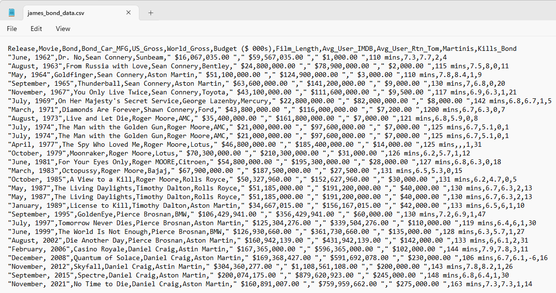 Because james_bond_data.csv is a text file, you can open it in any text editor. The screenshot below shows it opened in Notepad: