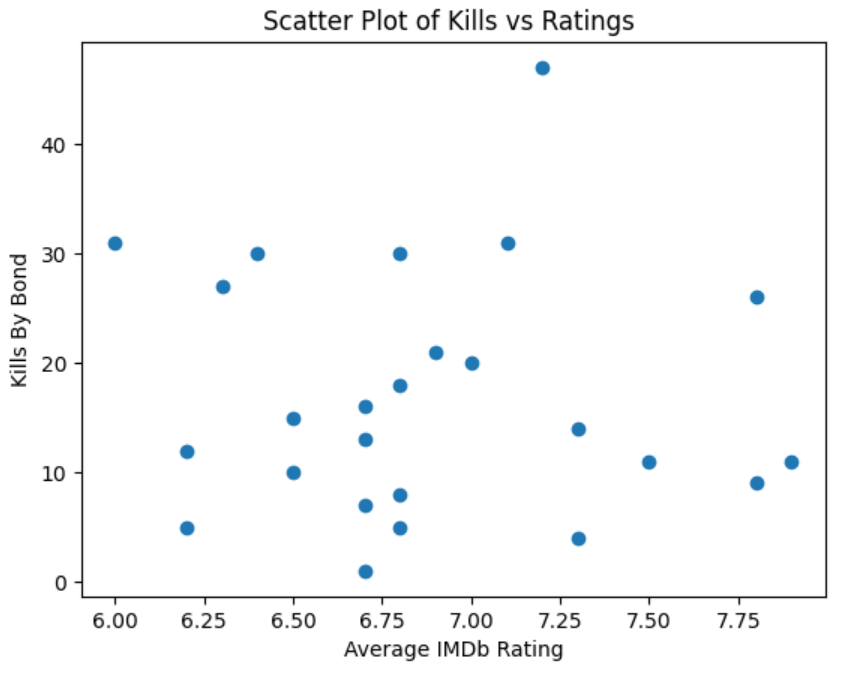 In this final analysis, you’ve been asked to investigate whether or not there’s any relationship between a movie’s user rating and the number of kills that Bond achieves in it.